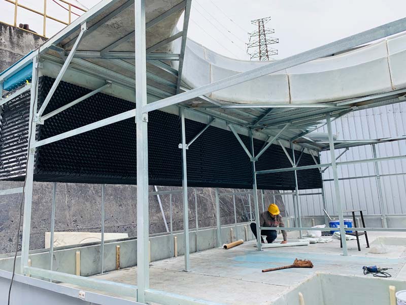 玻璃钢一般为横流冷却塔(水流从塔上部垂直落下,空气水平流动通过淋水填料,气流与水流正交的冷却塔)。