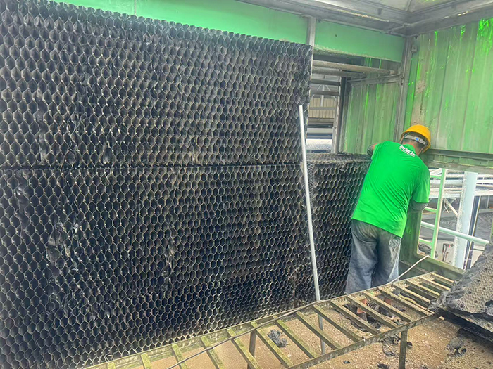 在拆除旧填料时,首先要确保安全操作,关闭电机电源,并小心地拆除冷却塔填料部位的拉筋。然后,逐步拆除旧填料,并彻底清理塔内的垃圾和杂物。