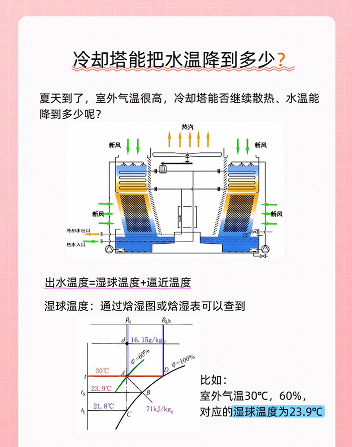 • 核心原理:冷却塔通过水的蒸发散热降温,而水的蒸发速率由空气的湿度(湿球温度)决定,无法冷却到比湿球温度更低的水平,否则水无法持续蒸发。