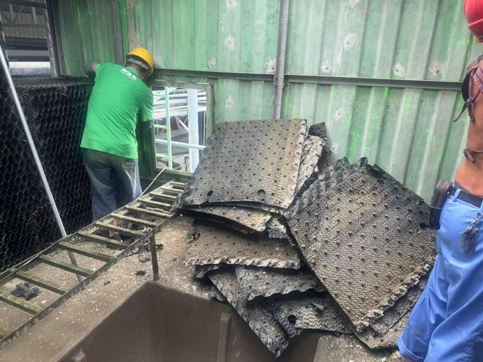 3.冷却塔在清洗保养进不能使用强酸如使用会腐蚀掉填料,造成填料损不而需更换.填料耐温50°C ~ 68°C间,如没有对冷却水系统做好保养工作,而导致水温过高填料片变形也会缩短填料的使用寿命,严重的就需更换填料以保 证换热效 果.