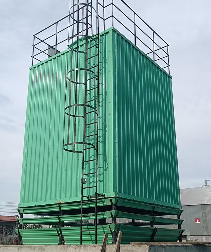 ◦ 结构:配备检修爬梯与顶部防护栏,塔体为方形逆流式设计,空气自下而上、水自上而下逆向流动,冷却效率更高。